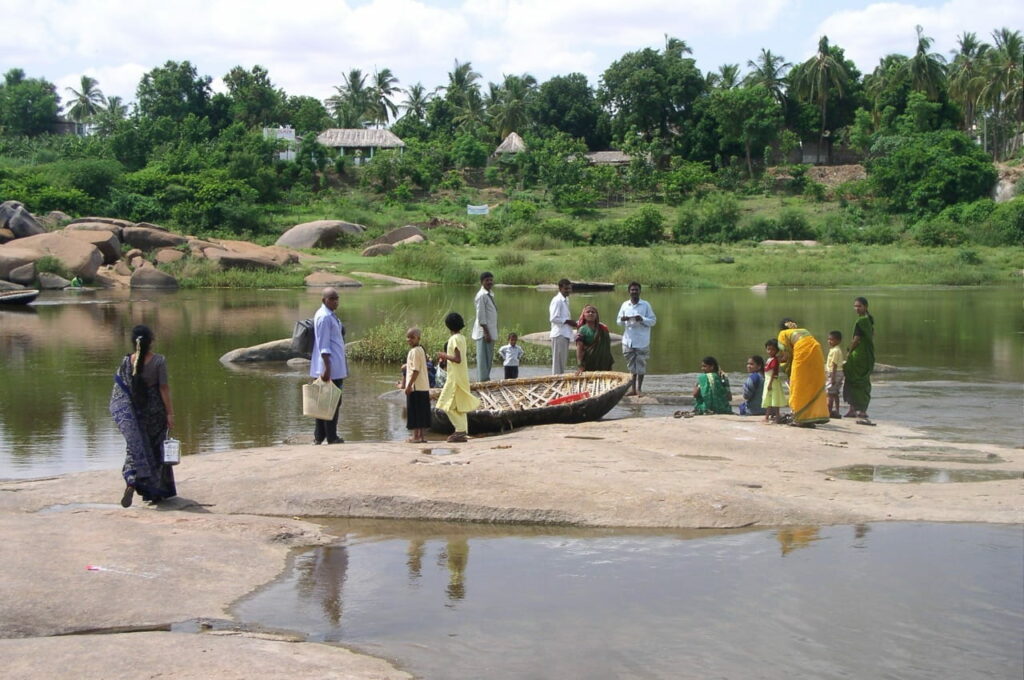 Hampi ne fascine pas uniquement par ses monuments : c’est un paysage hors du temps. Le village est posé au milieu d’un chaos de rochers roses, de rizières lumineuses et de palmeraies traversées par la rivière Tungabhadra. Cette nature surnaturelle, presque iréelle, est l’une des signatures du lieu.