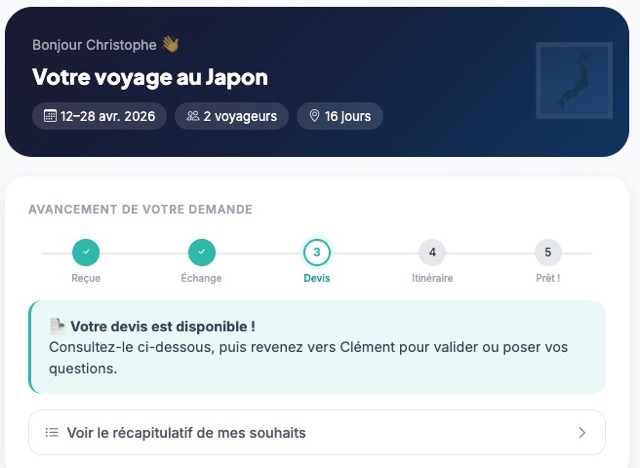 Autre nouveauté : vous pouvez désormais accéder à un espace de suivi en ligne pour votre projet de voyage. Vous y retrouverez :